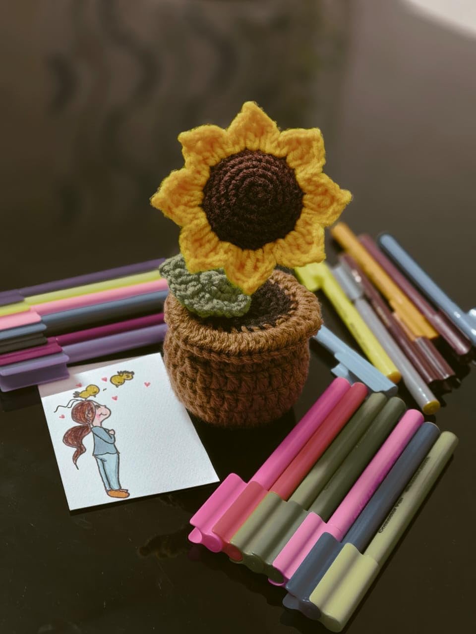 Details: Handmade Crochet Flower Set - Sunflowers & Daisies Knitted Potted Plants for Car Dash, Table, and Home Decoration – Pack of 1
