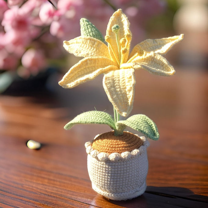 Design Featuring a delicately crafted crochet lily with detailed petals, lush green leaves, and a realistic bud, this arrangement is nestled in a soft yarn pot with a decorative scalloped edge.