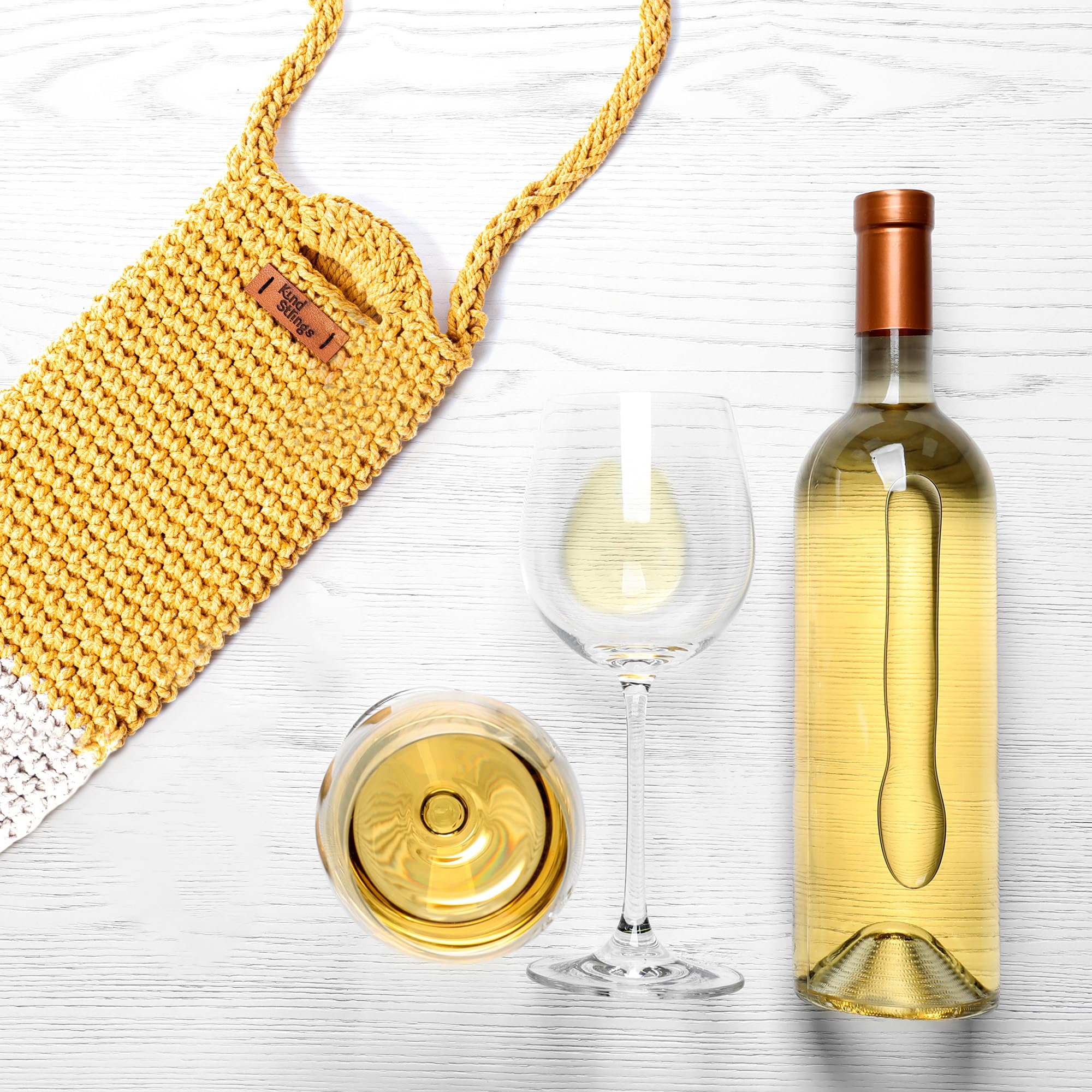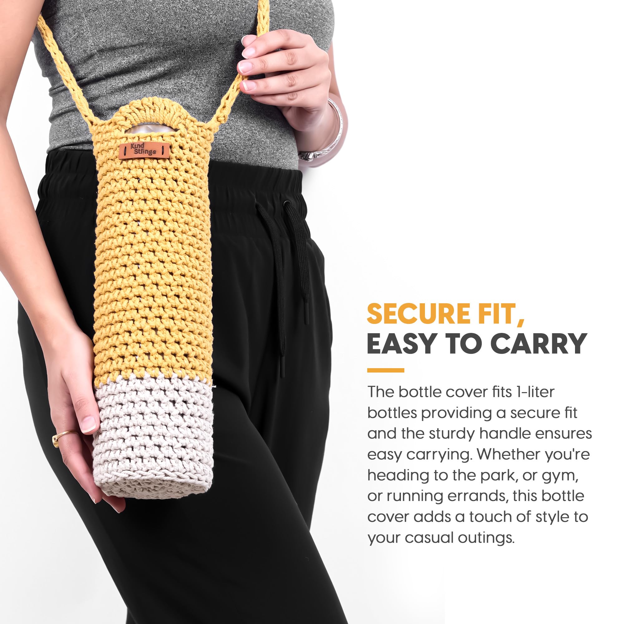 Crochet Sling Bottle Bag Handmade Cotton Water & Wine Bottle Holder (1 Litre) Eco-Friendly Reusable Gift Bag for Travel, Office, Picnic, Gym Yellow & Off White