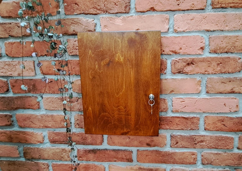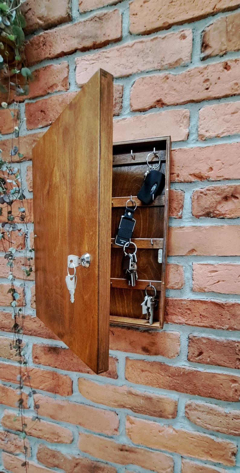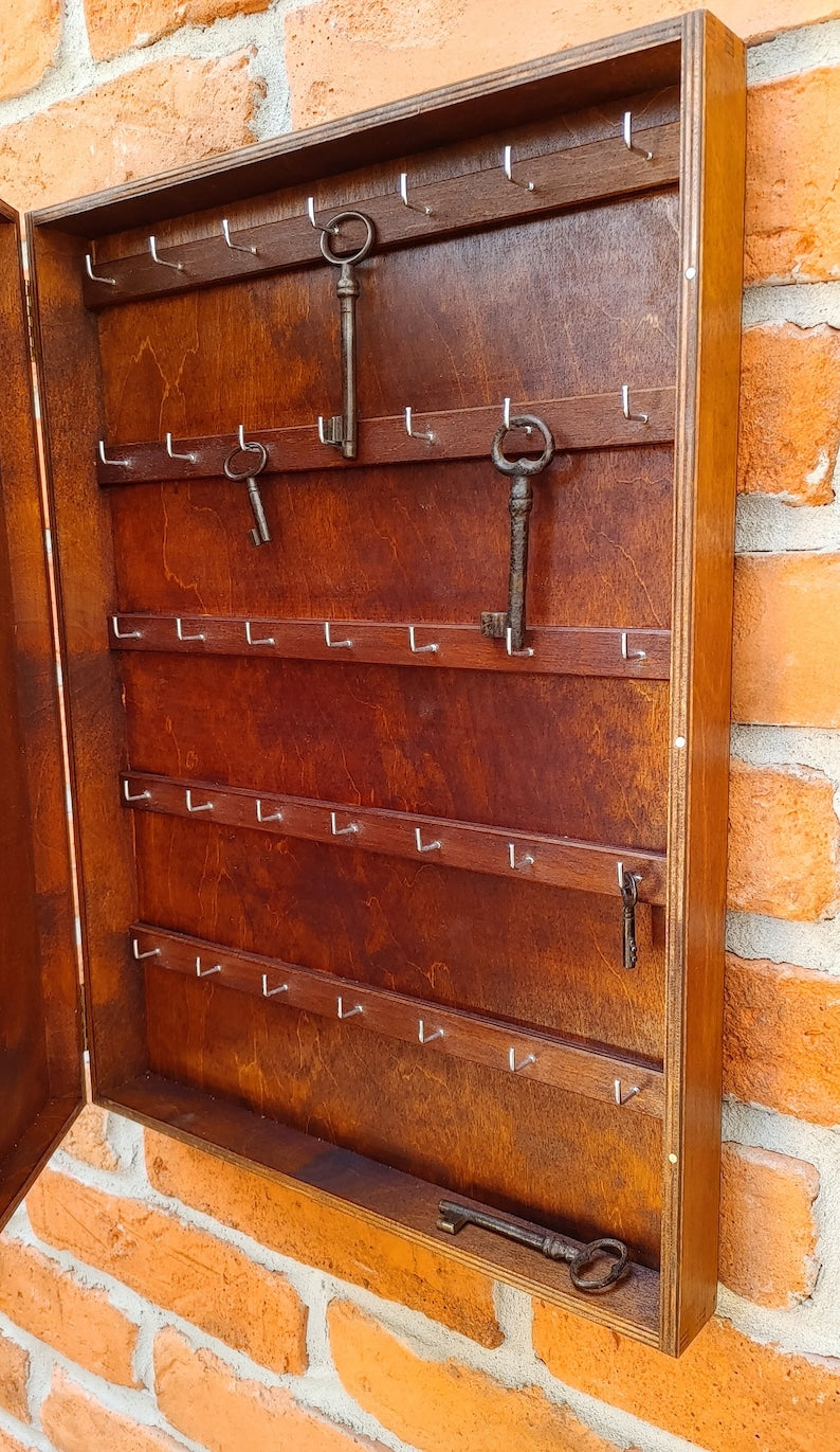 Natural wooden key box with lock and key. There are 35 hooks inside to hang your keys. The box is closed with keylock with three keys.