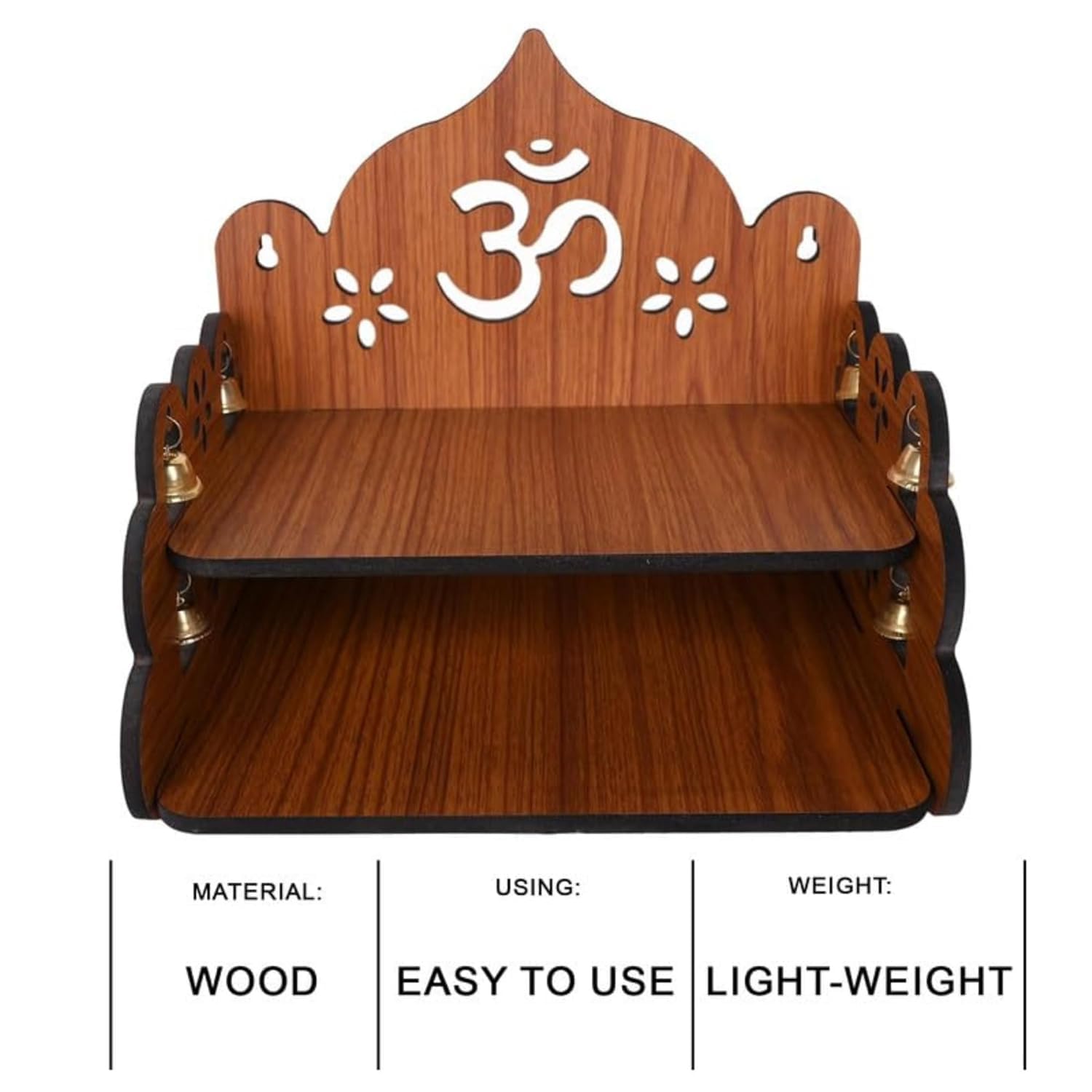 • Complete Puja Set: This pooja mandir comes with a pooja shelf for home, a temple bell, and a wooden jali for mandir, making it a complete pooja set. The small bells for pooja mandir create a calming atmosphere during prayers, while the god stand adds divine elegance. Perfect for pooja ghar or mandir cabinet storage.