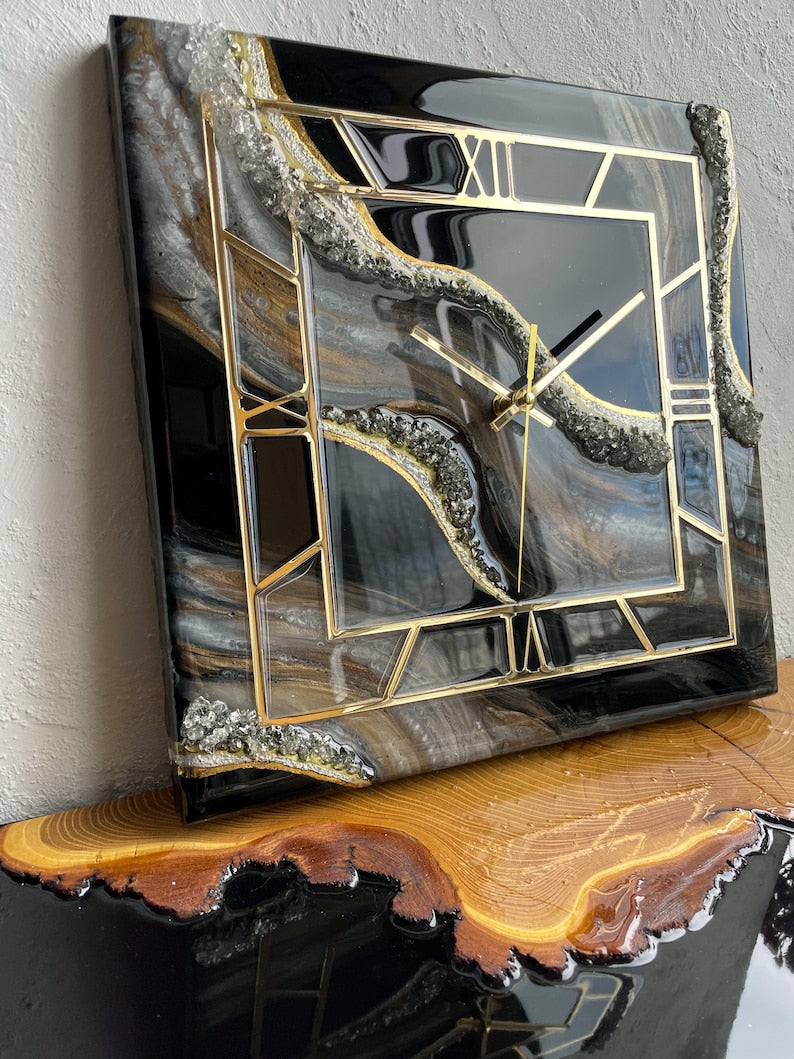 Large Black Gold Square Resin Wall Clock 12 Inch – Handmade Geode Epoxy Art, Crystal Edge, Roman Numerals, Silent Quartz, Luxury Statement Decor