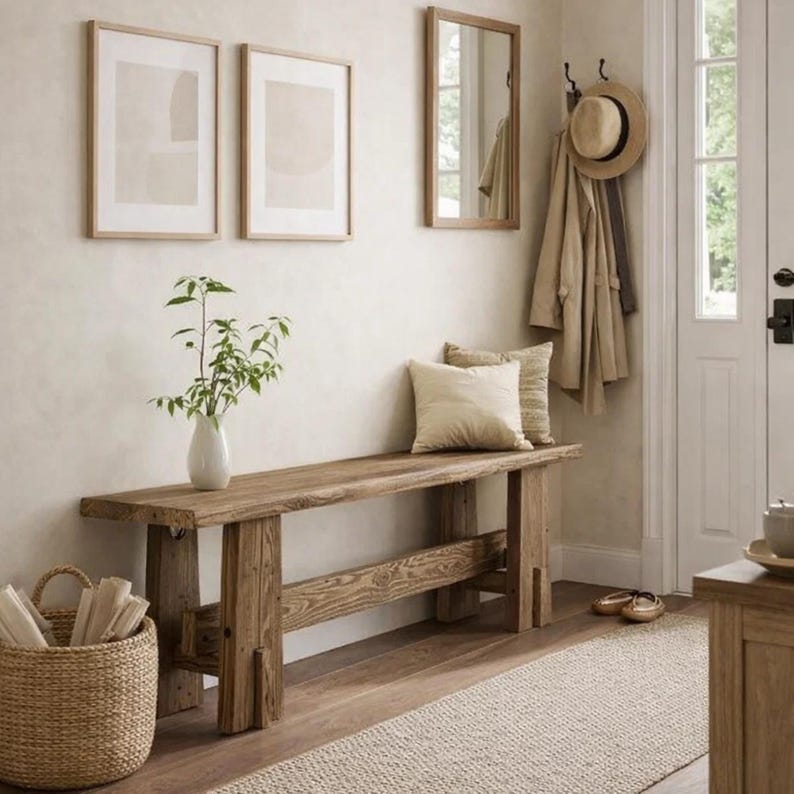Bring warmth, character, and practical seating into your home with this extra-long solid wood farmhouse bench. Designed with a clean rustic look and visible natural wood grain, this bench blends beautifully with farmhouse, vintage, rustic, and modern home décor styles.