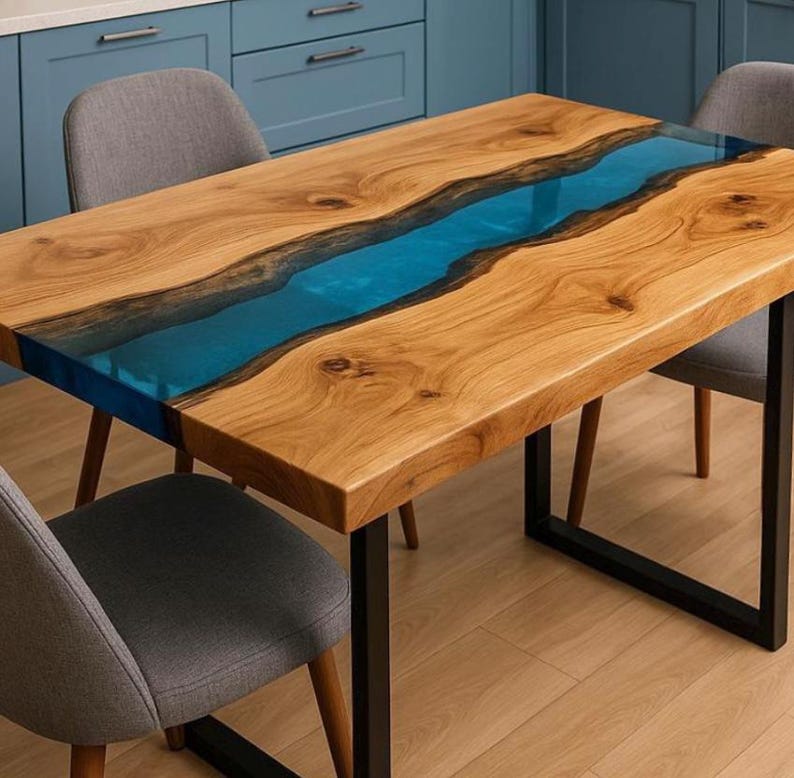 Resin Wooden Dining table made of epoxy resin in light blue color and made of Pine wood, epoxy table, resin art