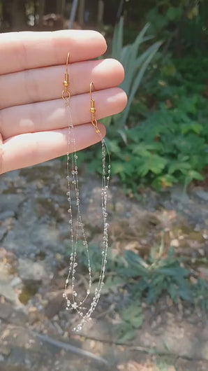 These dreamy, long dangle earrings are designed to look as if delicate raindrops are suspended in mid-air. Hand-strung on ultra-fine invisible thread, each earring features a cascade of crystal-clear teardrop and round glass beads that catch the light like morning dew.